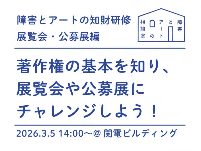 ▼対象者:障害のあるアーティスト、おもに近畿エリアで障害のある人のアート活動を支援している人、ご家族、かんでんコラボ・アート応募者など、公募展などへの応募をされたことがある人、そのほか著作権などの知的財産に関心のある人であればどなたでも参加いただけます。